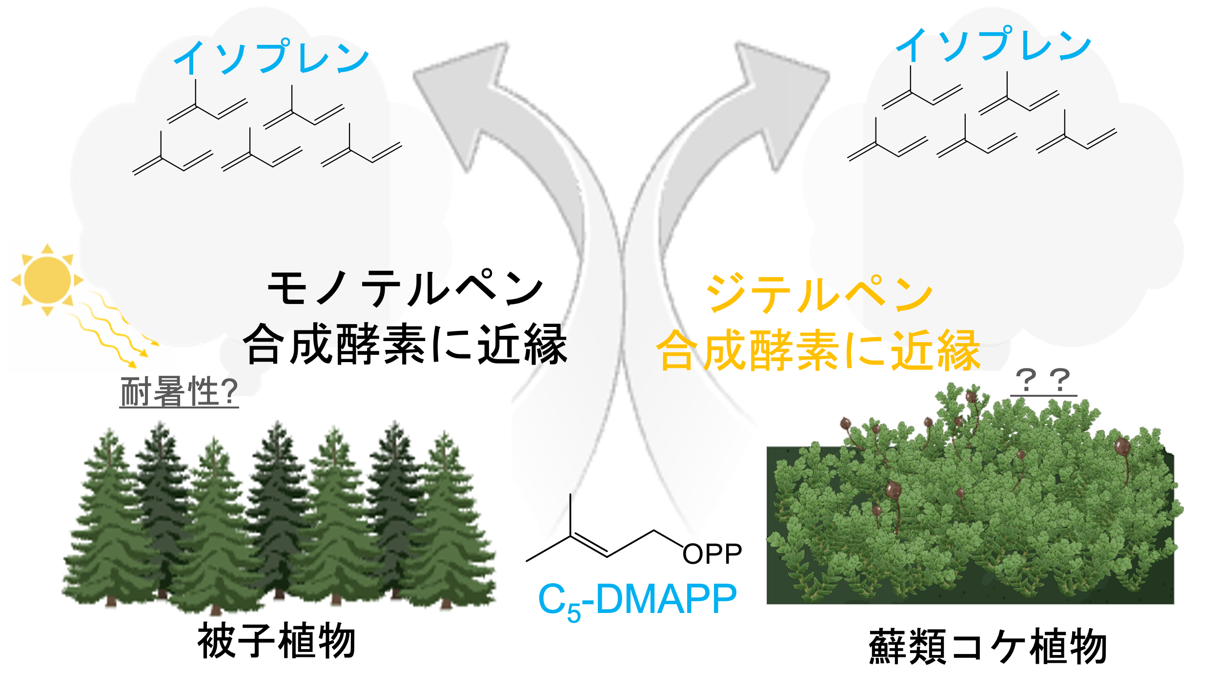 道端や庭先でよく見かけるコケ植物が温暖化を促進してしまう揮発性物質(イソプレン)を多く放出していることが分かっていました。最近私たちは,コケ植物は樹木とは異なる酵素でイソプレンを作ることを明らかとしました。しかし,コケ植物がどうしてイソプレンを放出するのかその理由は分かっていません。その理由を解明するだけでなく,放出の抑制を志向した化学制御剤の開発も進めています。