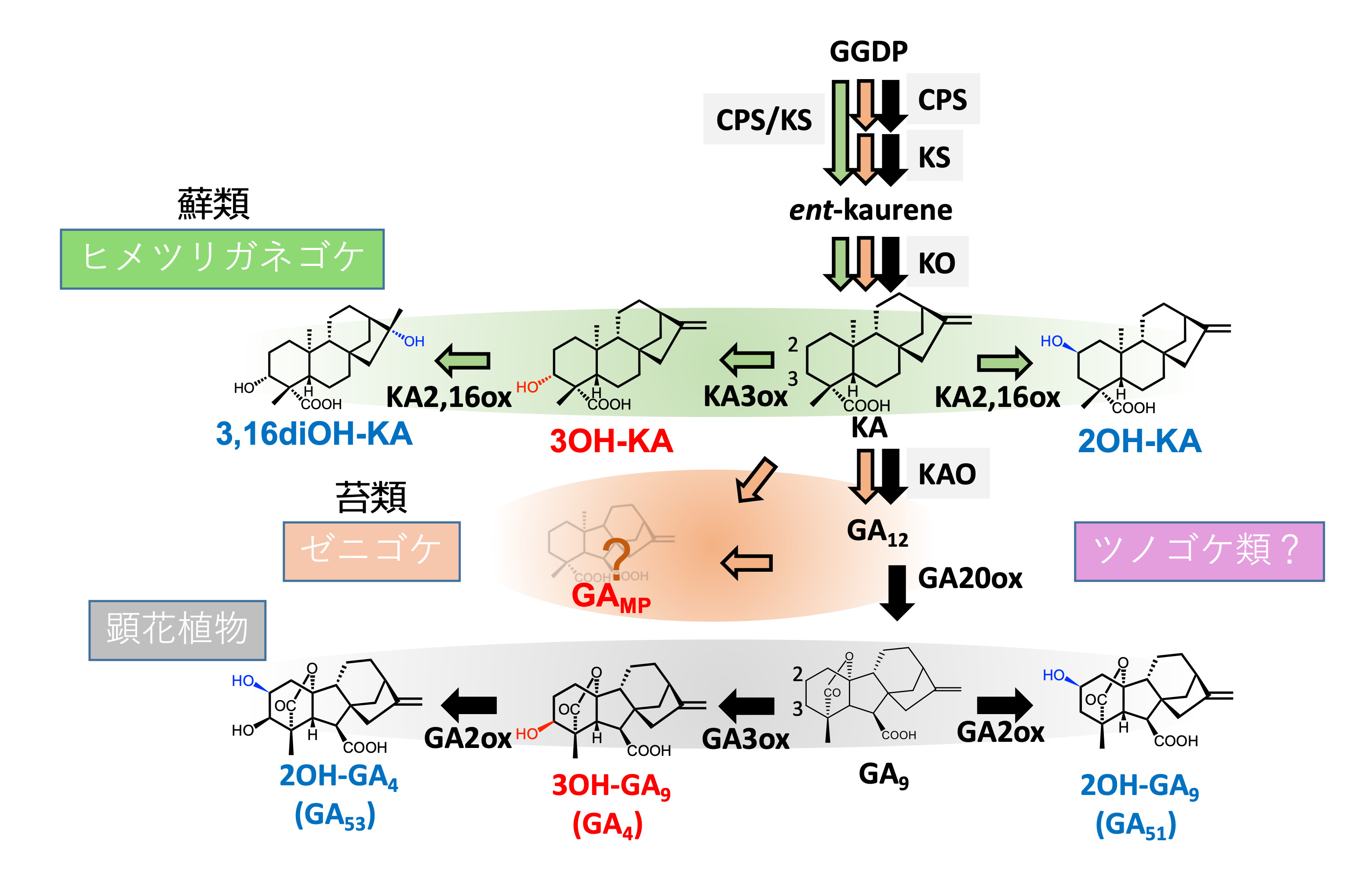 現代の植物がどのように成長制御能力を獲得したのでしょうか?植物に普遍的に存在する成長制御物質として植物ホルモンを学んだ人が多いかと思います。しかし興味深いことにある種のコケ植物はジベレリン(GA)という植物ホルモンをつくらず,その生産過程からGAの起源物質(3OH-KAやGAMP)を作っていることが判明しました。GA起源物質の特異性や普遍性を研究することで,GAはどこから来たのか進化的な視点でも研究を進めます。また,コケが持つ独自の成長制御の仕組みを理解することで,新しい植物成長調節剤の開発や,環境ストレスに強い作物の開発などにつなげています。